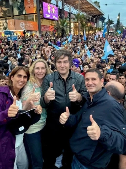 Rodeado por una gran cantidad de militantes libertarios, el mandatario dio un mensaje con un megáfono sobre la parte trasera de una camioneta, junto a la presidenta de La Libertad Avanza, Karina Milei y el candidato a diputado nacional por Córdoba Gonzalo Roca.